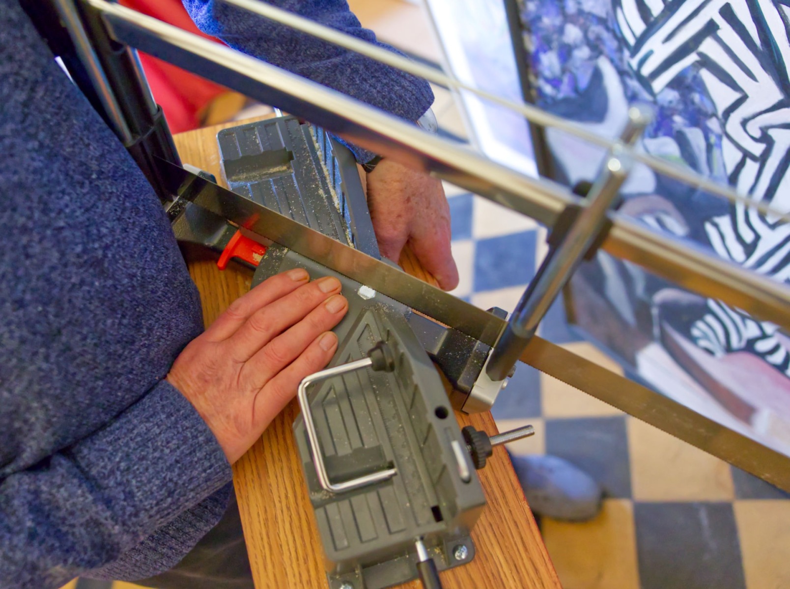 Das Handwerk bedarf natürlich einer entsprechenden Technik. Mit einer Gehrungssäge fertige ich die Schnitte für die Rahmen an.