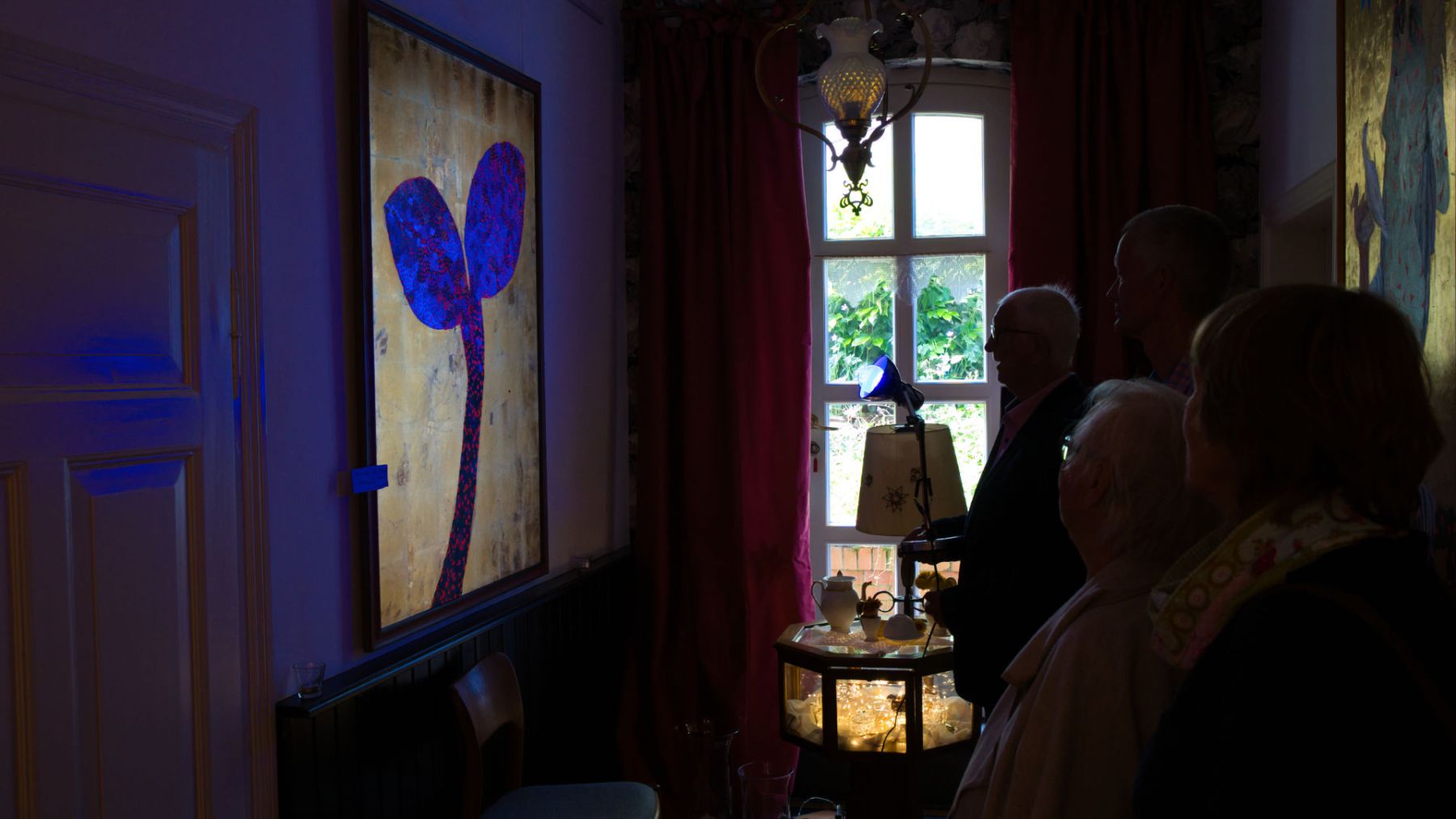 Im Flur zeige ich den Besuchern meine Werke mit fluoreszierender Farbe, deren Effekt erst bei Schwarzlicht zur Geltung kommt.
